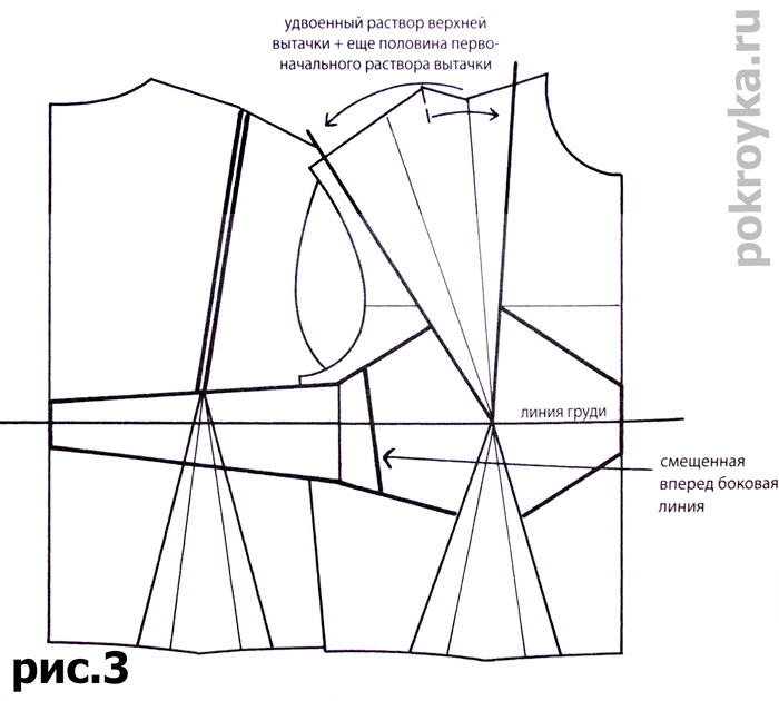 Для больших размеров чашек потребуется большее увеличение растворов вытачек. Еще увеличьте раствор верхней вытачки на половину первоначального раствора вытачки, как показано на илл.3 (для размера С и больше).